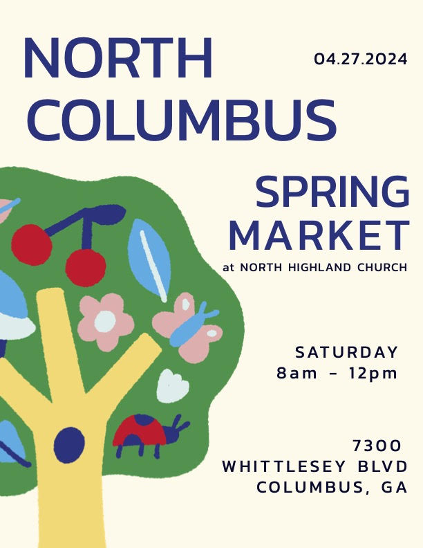 North Highland Church is hosting the North Columbus Spring Market on April 27th from 8 AM to 12 PM. Local vendors and food trucks will be set up on the front lawn for a fun Saturday morning. This event will be raising money for missions through our kids giving initiative, BGMC.